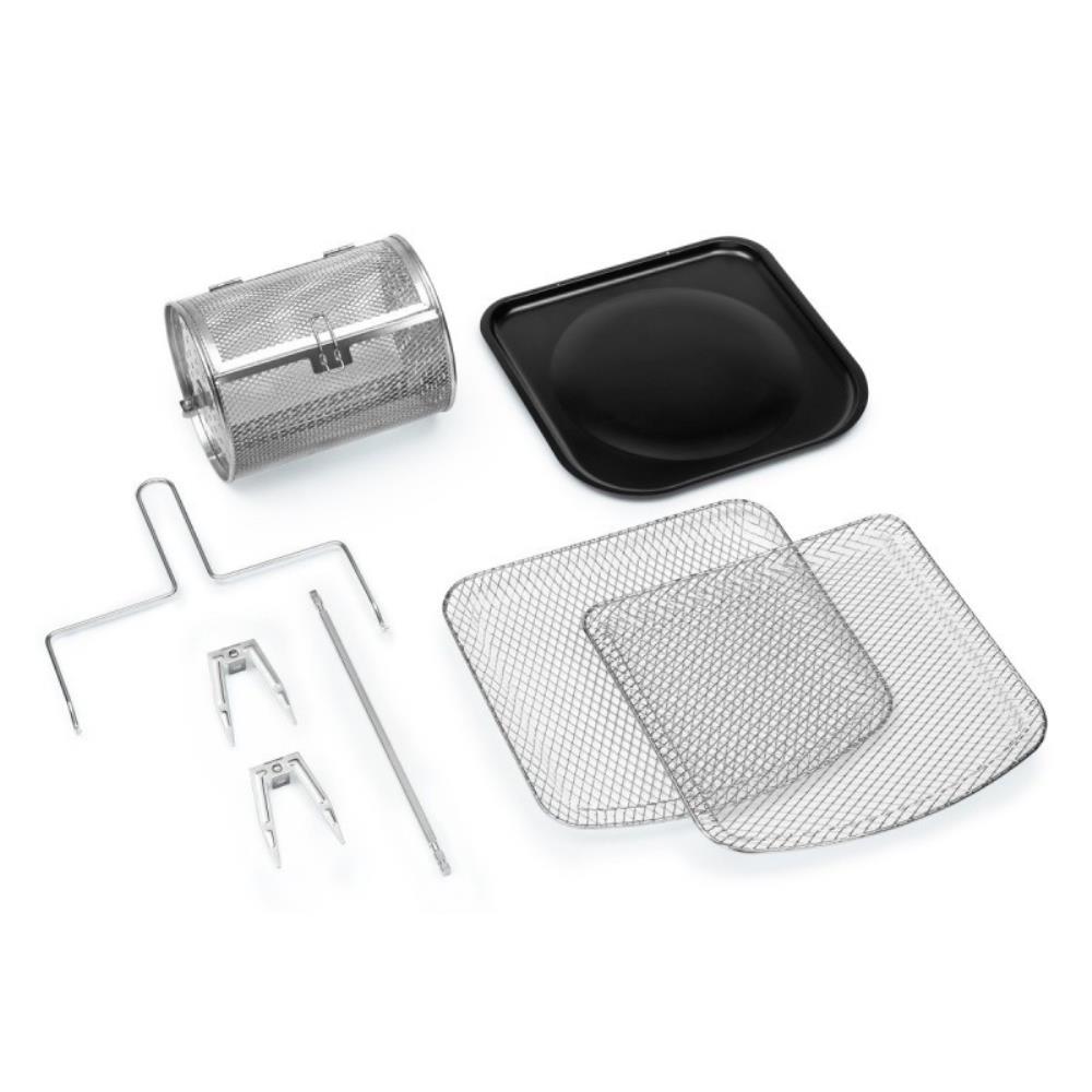 Também inclui 6 acessórios: 2 bandejas de assar, bandeja de recolha de óleo, pinças extractoras, cesto redondo giratório de 2,9L e ganchos de assar.