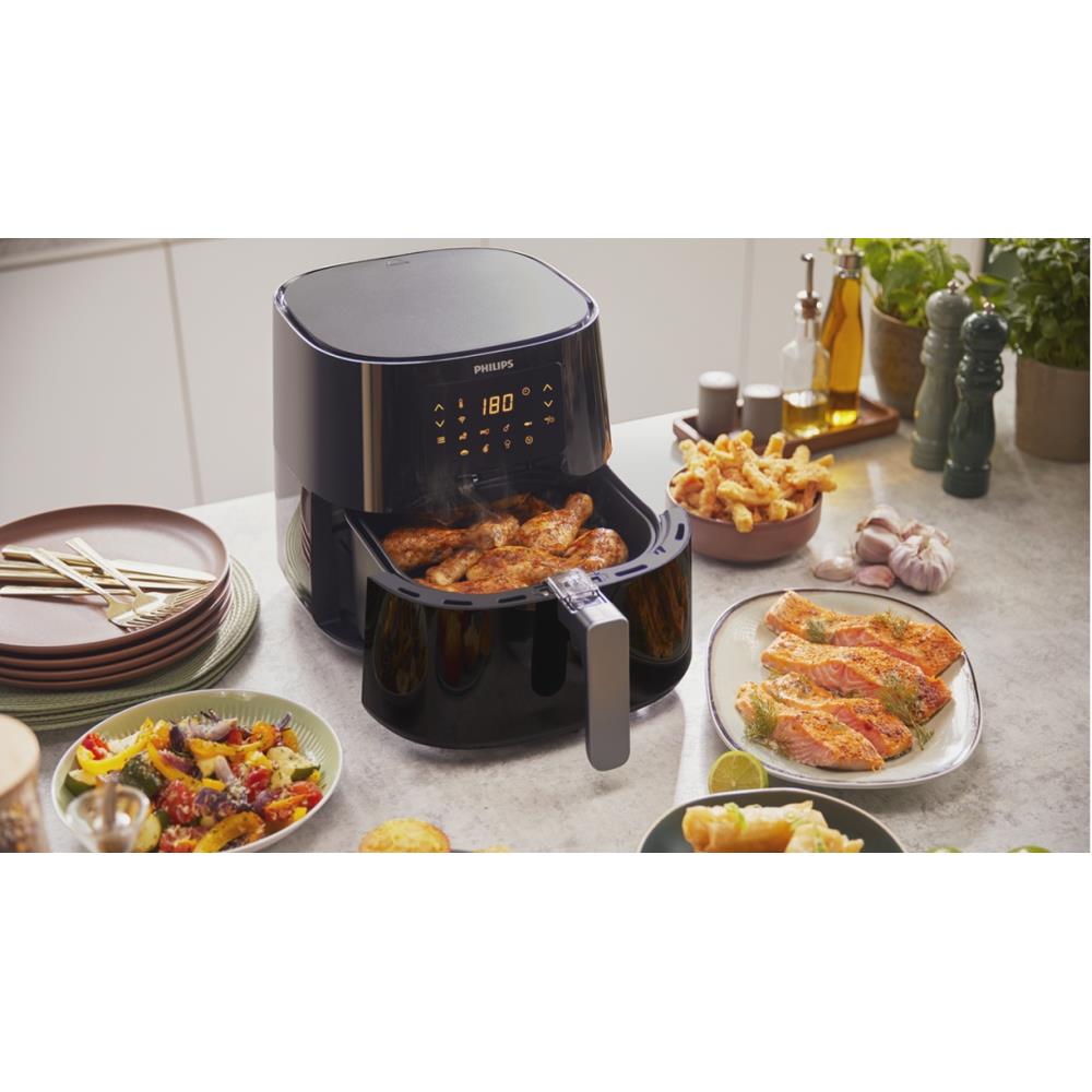 Philips Essential HD9280/70. Tipo de produto: Frigideira a ar quente, Capacidade: 6,2 l, Capacidade da fritadeira: 1,2 kg. Tipo de construção: Individual, Cor do produto: Preto, Prateado, Tipo de controlo: Toque. Tipo de monitor: LED. Potência: 2000 W. Largura: 403 mm, Profundidade: 315 mm, Altura: 307 mm